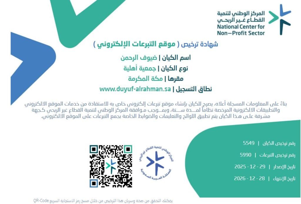 جمعية ضيوف الرحمن هي جمعية اهلية متخصصة في خدمة ضيوف الرحمن بمنطقة مكة المكرمة والمدينة المنورة مرخصة من المركز الوطني للتنمية القطاع الغير ربحي برقم 5549 وتاريخ 29/5/1445 ه ويشرف عليها فنيا وزارة الحج و العمرة تأسست الجمعية علي قيم العطاء والرحمة والتفاني في خدمة ضيوف الرحمن وتسعي الجمعية ان تكون من افضل الجمعيات الرائدة وفق عمل مؤسسي ومبادرات مبتكرة وشراكات فاعلة لخدمة الحاج والمعتمر والزائر وتحسين وتطوير وتوسيع عمل الجمعية ليشمل برامج متنوعة تدعم زائر الحرم المكي والمسجد النبوي وتقديم ما يخدم المجتمع داخل نطاق خدمات الجمعية للحرمين الشرفين.